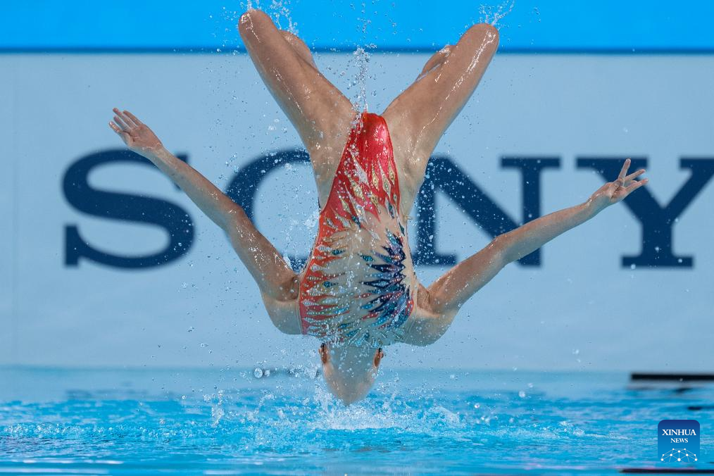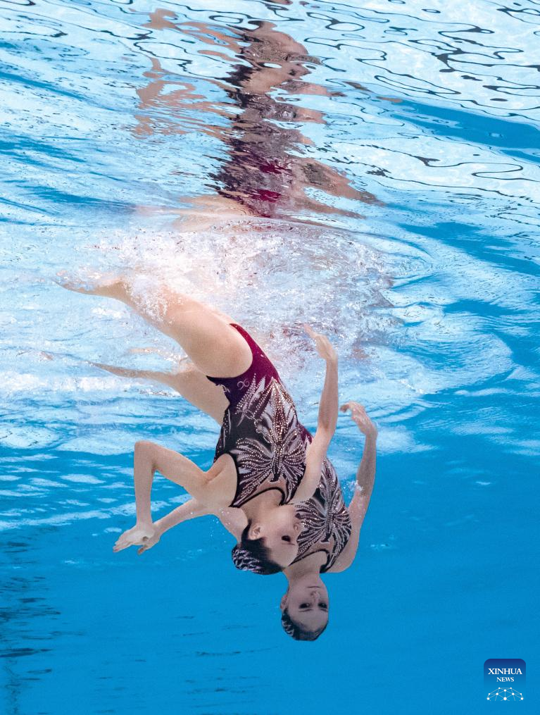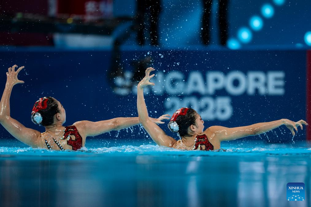 Kobayashi Uta/Sato Tomoka of Japan perform during the women's duet free final of artistic swimming at the World Aquatics Championships in Singapore, July 24, 2025. (Xinhua/Wu Zhizun)