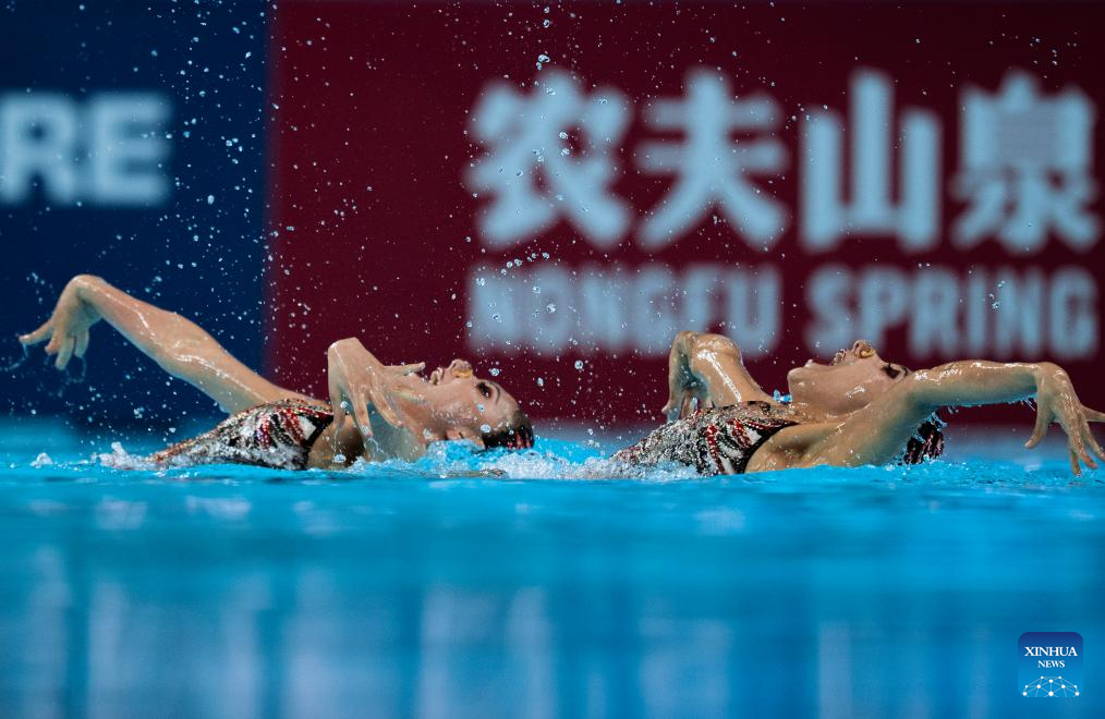 Lilou Lluis Valette/Iris Tio Casas of Spain perform during the women's duet free final of artistic swimming at the World Aquatic Championships in Singapore, July 24, 2025. (Xinhua/Xia Yifang)