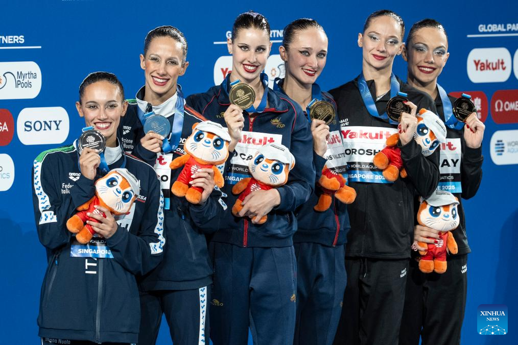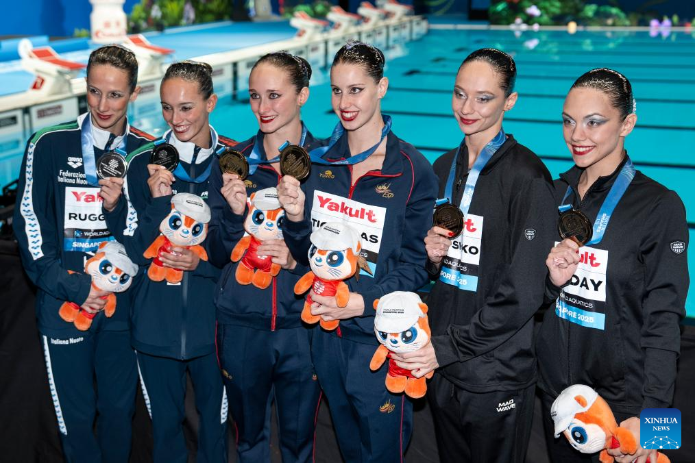 Medalists pose during the awarding ceremony after the women's duet free final of artistic swimming at the World Aquatics Championships in Singapore, July 24, 2025. (Xinhua/Wu Zhizun)