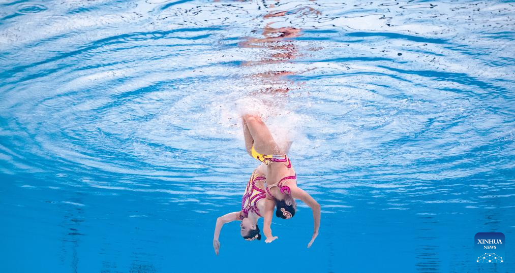 Lin Yanhan/Lin Yanjun of China perform during the women's duet free final of artistic swimming at the World Aquatics Championships in Singapore, July 24, 2025. (Xinhua/Wu Zhizun)