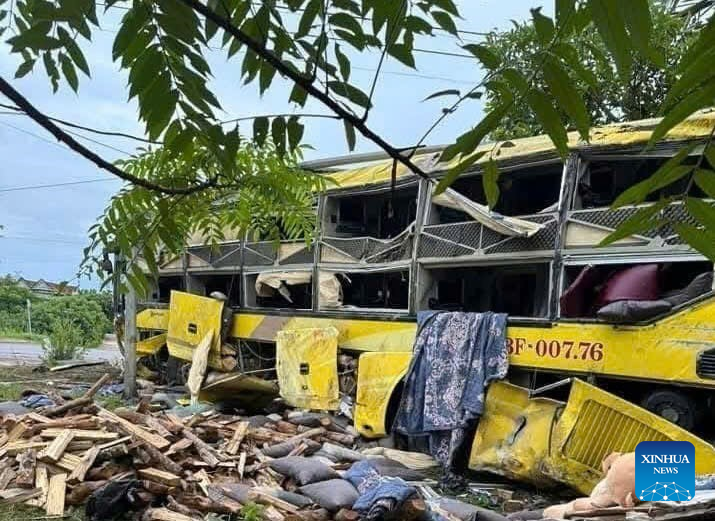 This photo taken on July 25, 2025 shows the overturning site of a sleeper bus in Vietnam's central province of Ha Tinh. At least nine people were killed and 16 others severely injured when a sleeper bus overturned in Vietnam's central province of Ha Tinh early Friday morning, Vietnam News Agency reported. (VNA/Handout via Xinhua)