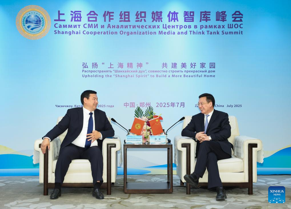 Fu Hua, president of Xinhua News Agency, meets with Mederbek Shermetaliev, director of the Kabar News Agency of Kyrgyzstan, in Zhengzhou, central China's Henan Province, July 24, 2025. Fu on Thursday held separate meetings with media leaders attending the Shanghai Cooperation Organization (SCO) Media and Think Tank Summit here. (Xinhua/Huang Jingwen)
