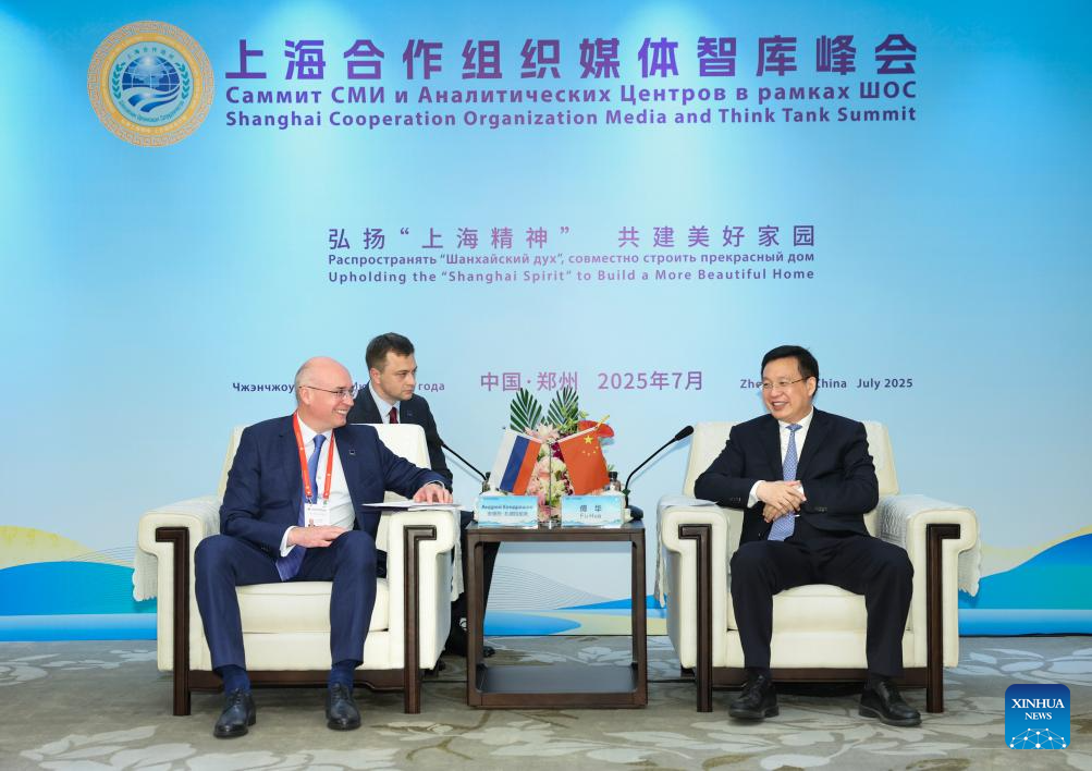 Fu Hua, president of Xinhua News Agency, meets with Andrey Kondrashov, director general of Russia's TASS news agency, in Zhengzhou, central China's Henan Province, July 24, 2025. Fu on Thursday held separate meetings with media leaders attending the Shanghai Cooperation Organization (SCO) Media and Think Tank Summit here. (Xinhua/Huang Jingwen)