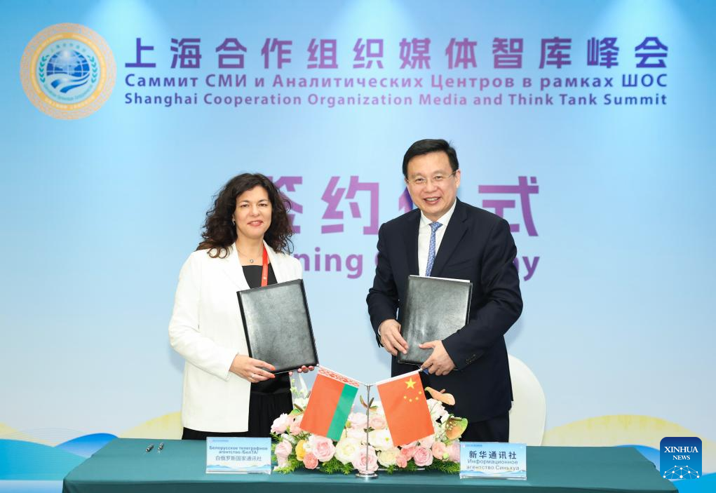 President of Xinhua News Agency Fu Hua attended the agreement exchange and signing ceremonies with Abdullah Kose, vice general manager of Turkiye's Demiroren Media; Mohammed Alyami, director general of the Union of News Agencies of the Organization of Islamic Cooperation; and Iryna Akulovich, director general of the Belarusian Telegraph Agency.