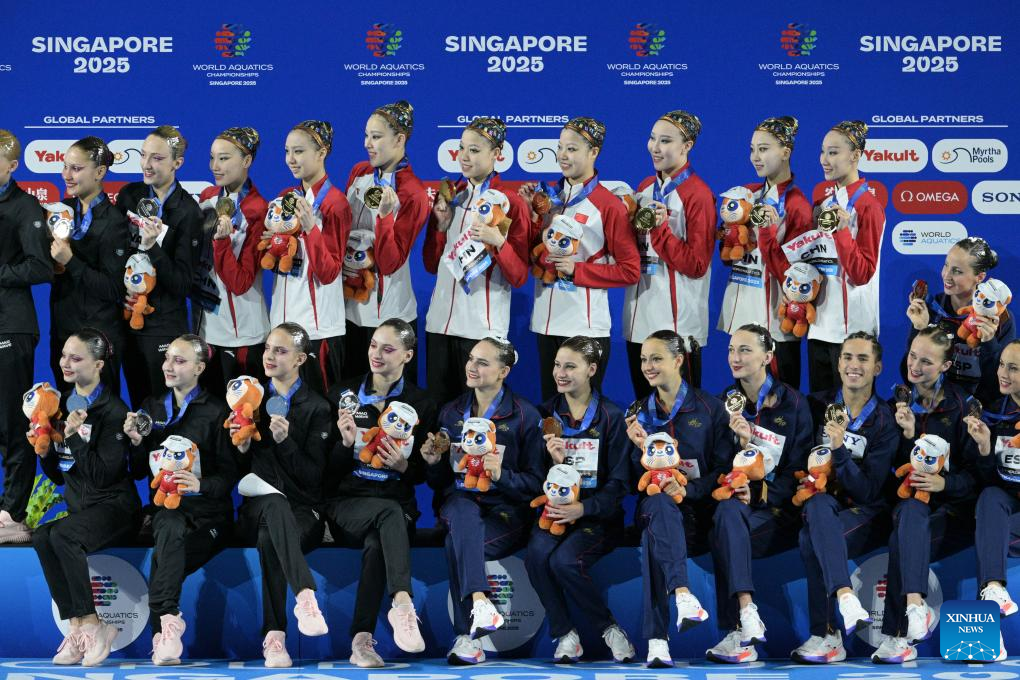 Gold medalists Team China pose for photo after the awarding ceremony for the team acrobatic of artistic swimming at the World Aquatics Championships in Singapore, July 25, 2025. (Xinhua/Wu Zhizun)