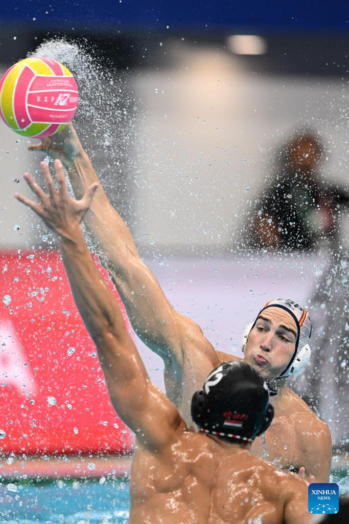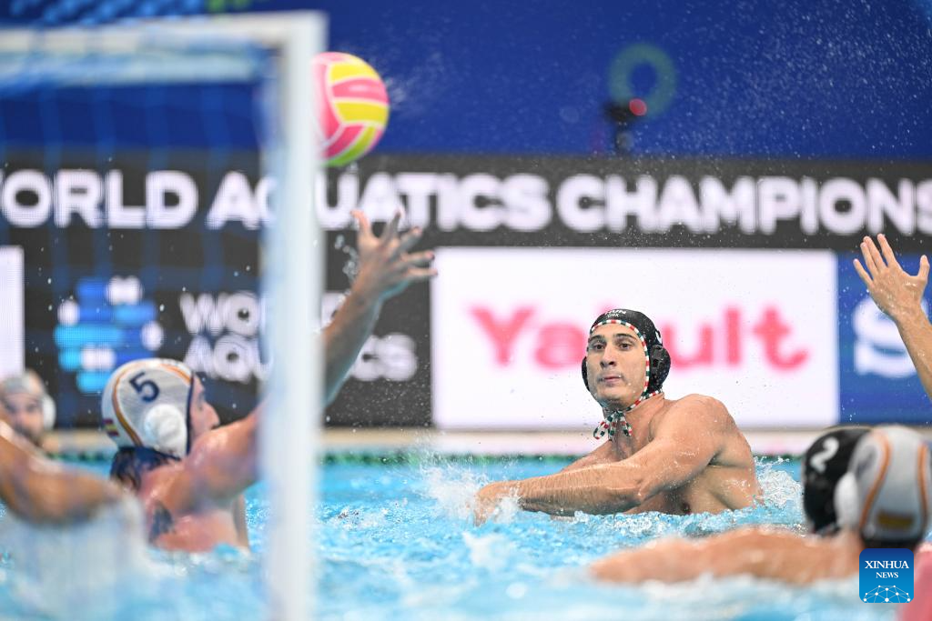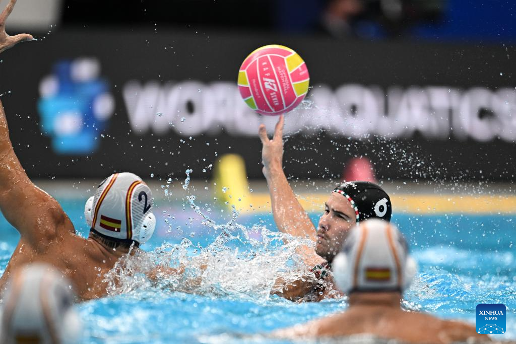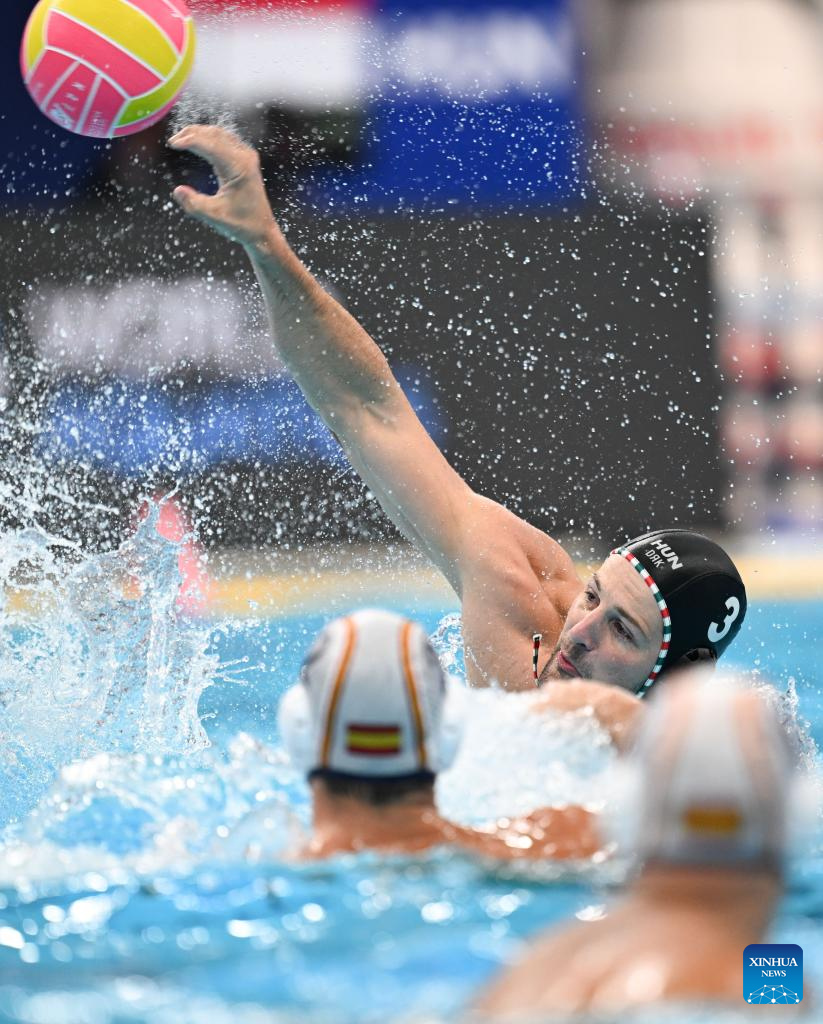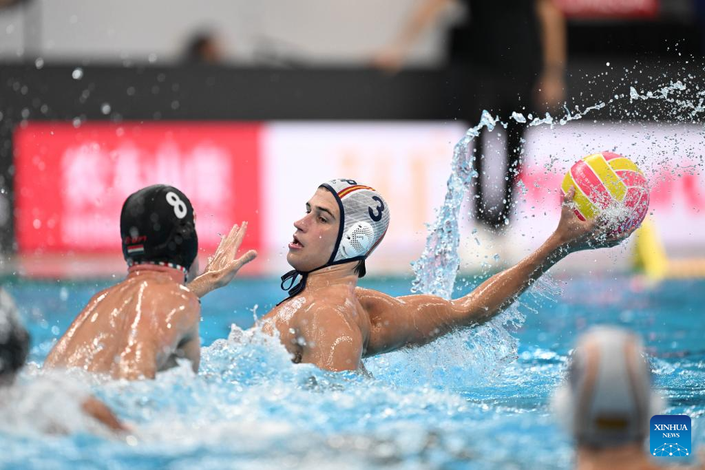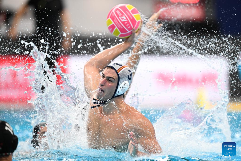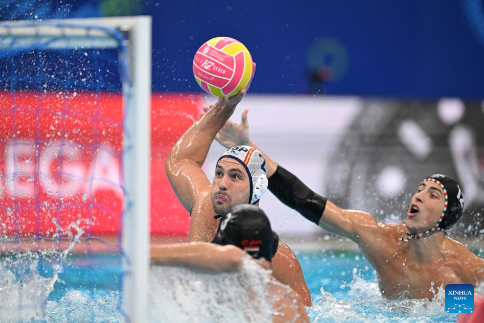 Alvaro Granados Ortega of Spain competes during the water polo men's gold medal match between Spain and Hungary at the World Aquatics Championships 2025 in Singapore on July 24, 2025. (Xinhua/Xue Yuge)