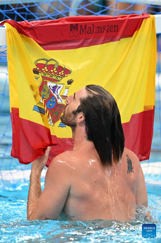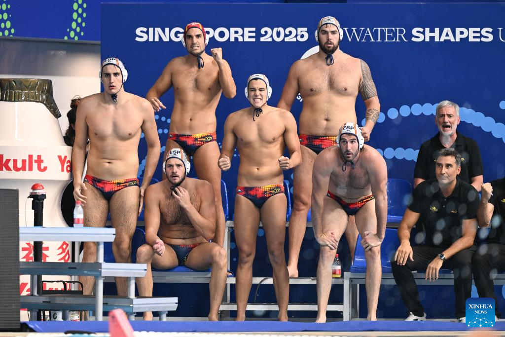 Players of Spain react during the water polo men's gold medal match between Spain and Hungary at the World Aquatics Championships 2025 in Singapore on July 24, 2025. (Xinhua/Xue Yuge)