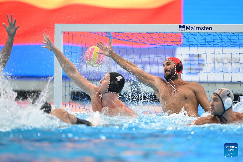 Kristof Csoma (2nd R), goalkeeper of Hungary, competes during the water polo men's gold medal match between Spain and Hungary at the World Aquatics Championships 2025 in Singapore on July 24, 2025. (Xinhua/Xue Yuge)
