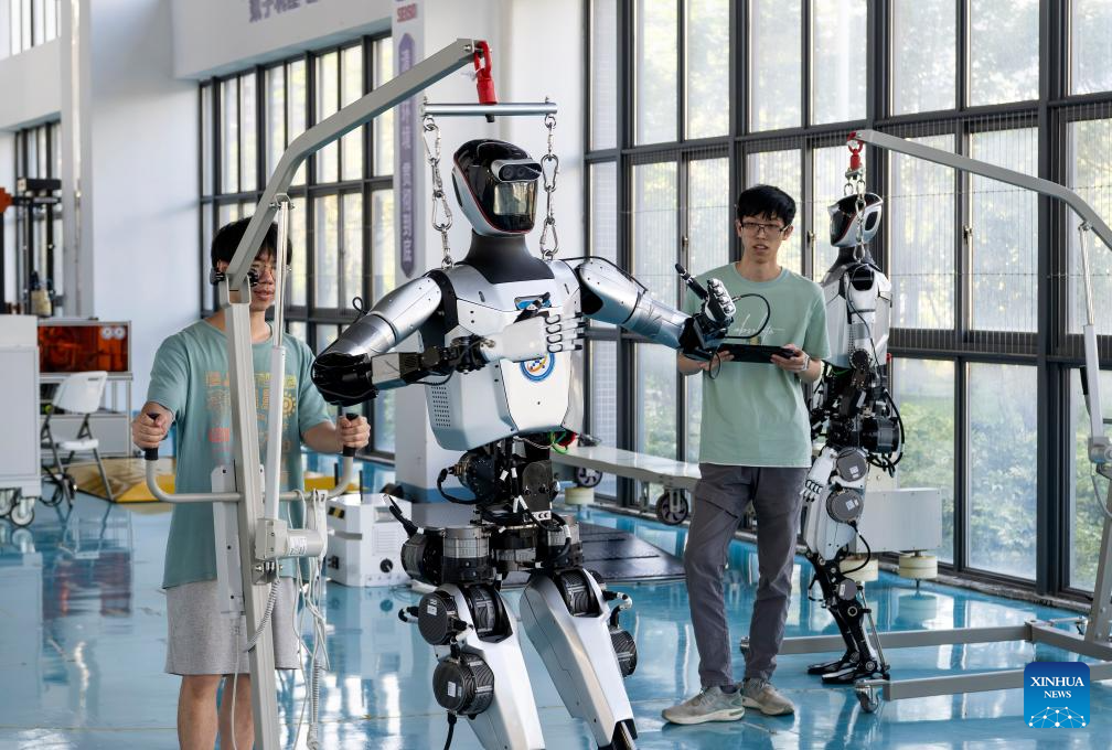 Staff members debug humanoid robots at Fujian (Quanzhou) Institute of Advanced Manufacturing Technology in Quanzhou, southeast China's Fujian Province, July 24, 2025. (Xinhua/Wei Peiquan)