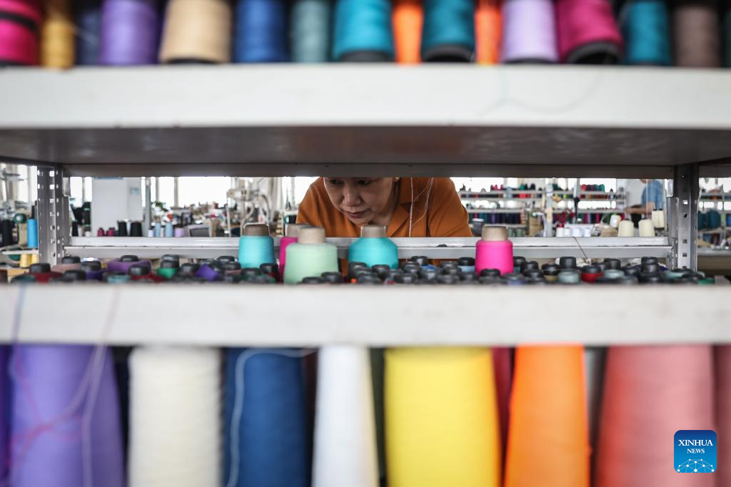 A staff member selects raw materials at a swimwear company in Xingcheng City, northeast China's Liaoning Province, July 16, 2025. Xingcheng, a tiny coastal city with a population of less than 500,000, has quietly emerged as a global giant in the swimwear industry. It produces an astonishing 170 million pieces of swimwear every year -- one out of every four swimwear items sold worldwide is made here. (Xinhua/Pan Yulong)
