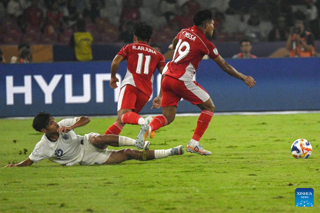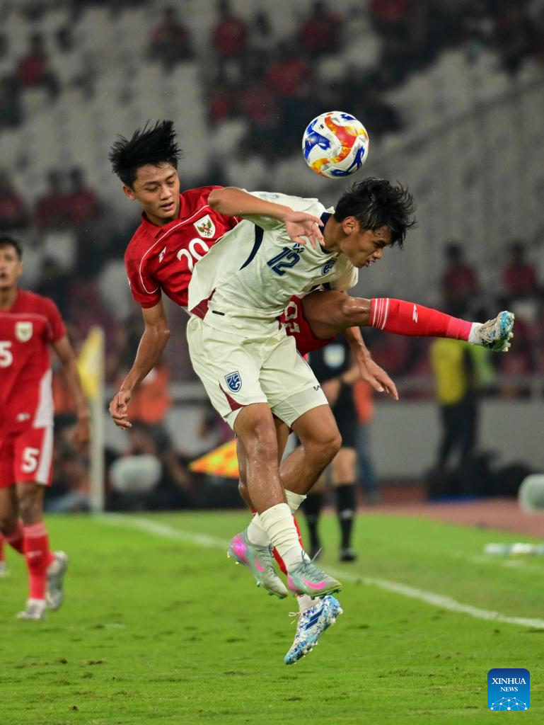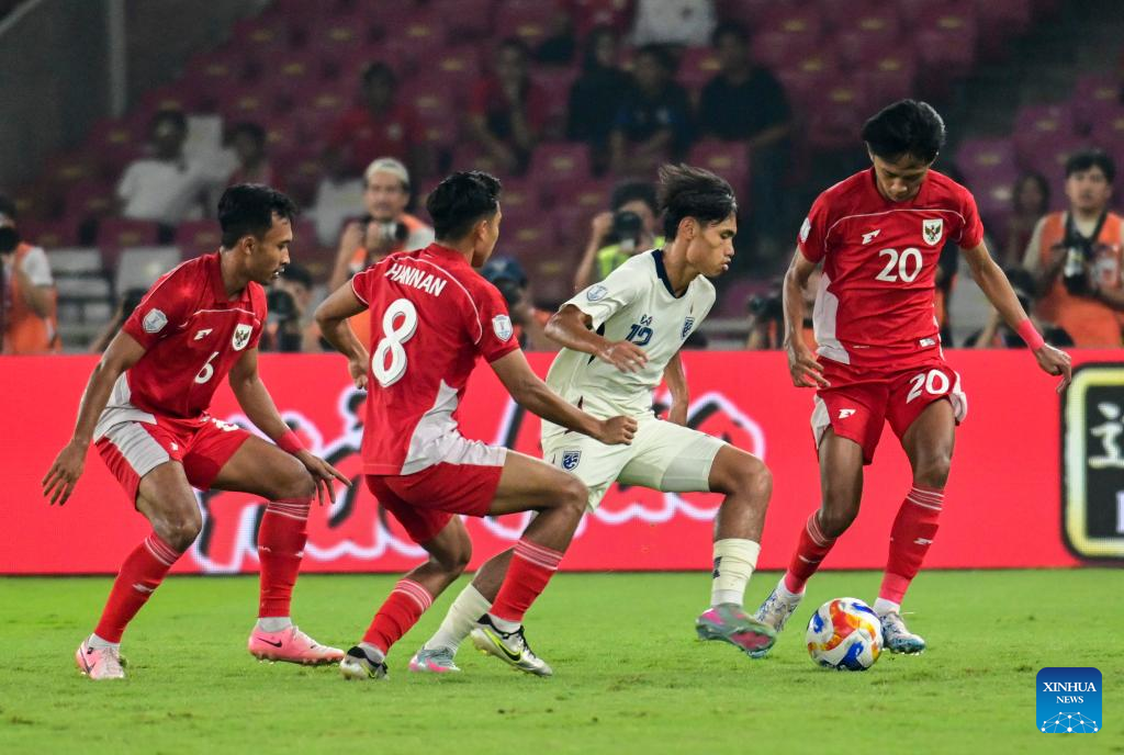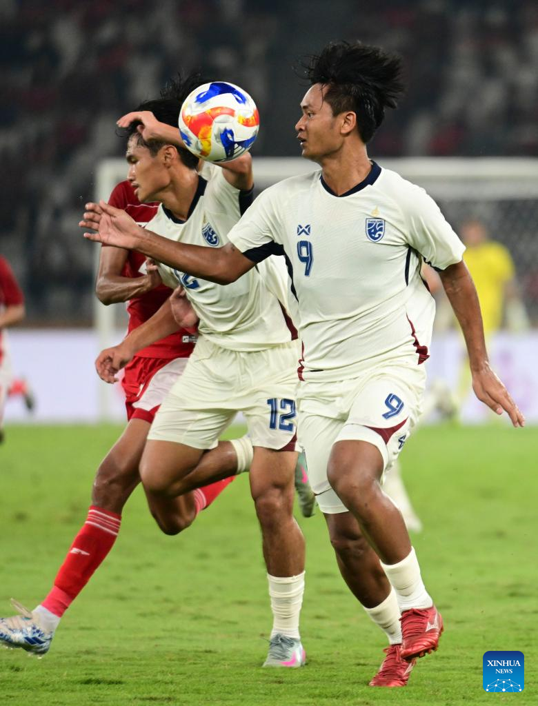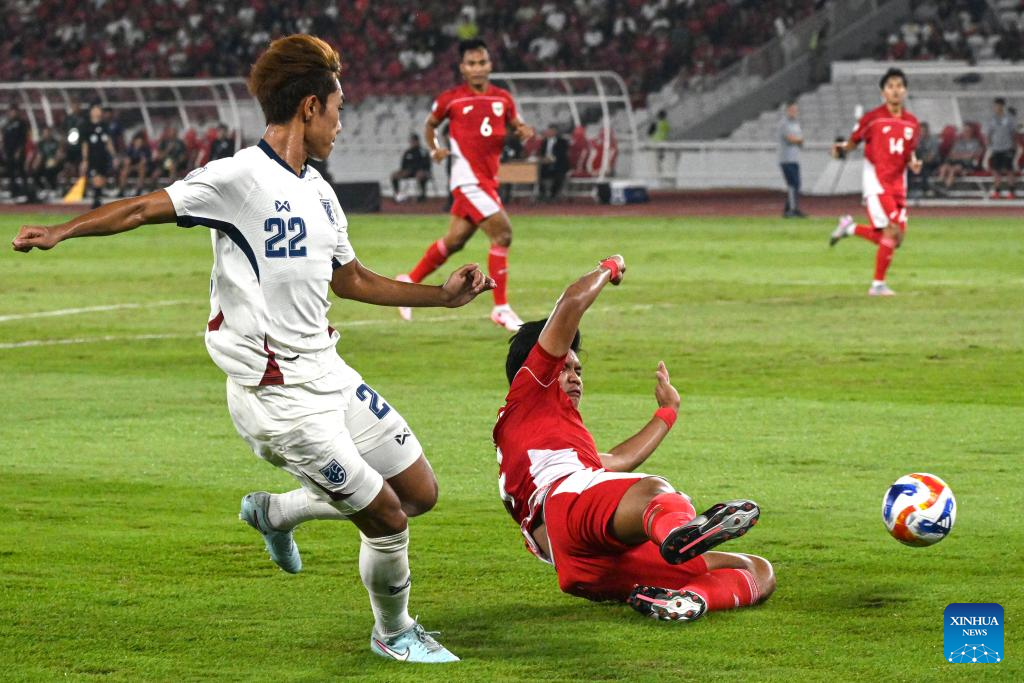Siraphop Wandee (2nd R) of Thailand competes during the ASEAN Football Federation (AFF) U23 Championship 2025 semifinal between Indonesia and Thailand in Jakarta, Indonesia, July 25, 2025. (Xinhua/Zulkarnain)