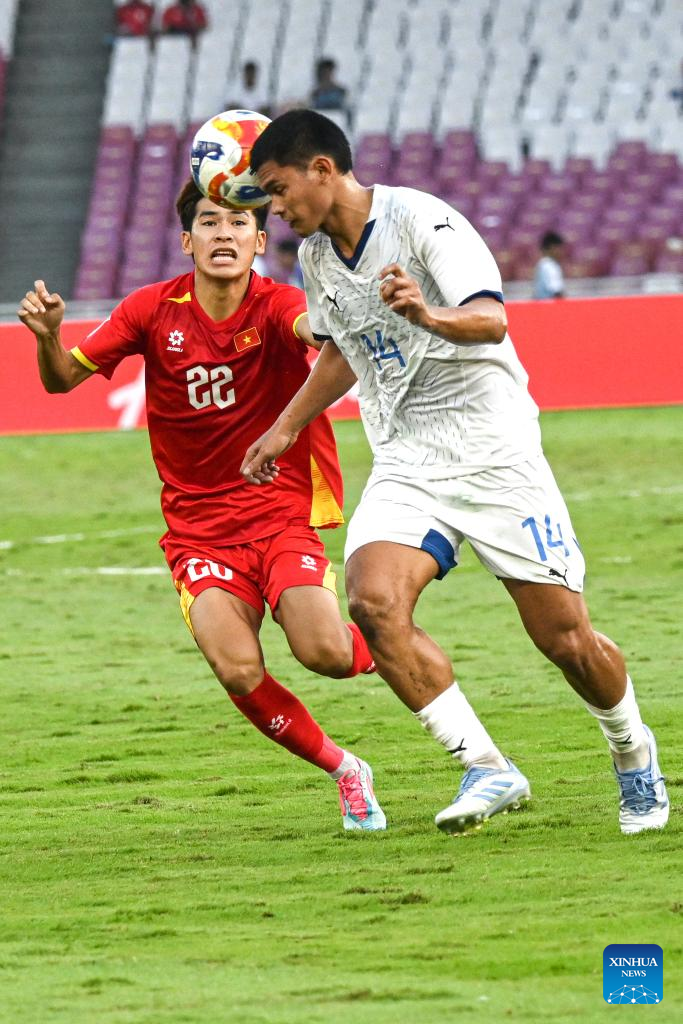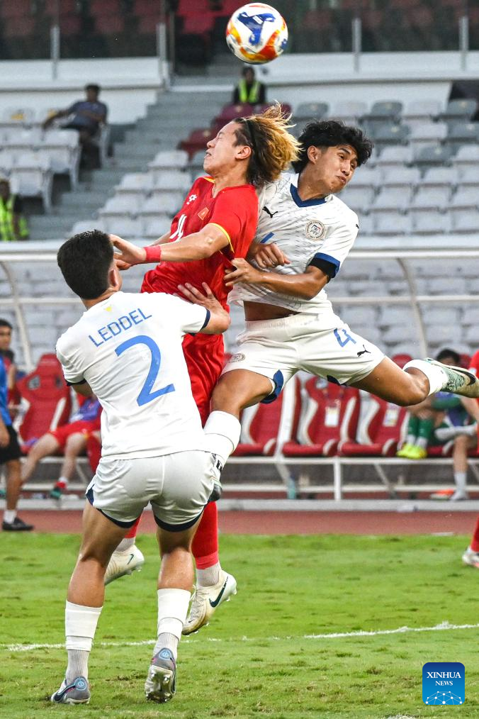 Viktor Le (C) of Vietnam vies for the ball during the ASEAN Football Federation (AFF) U23 Championship 2025 semifinal between Vietnam and the Philippines in Jakarta, Indonesia, July 25, 2025. (Xinhua/Agung Kuncahya B.)