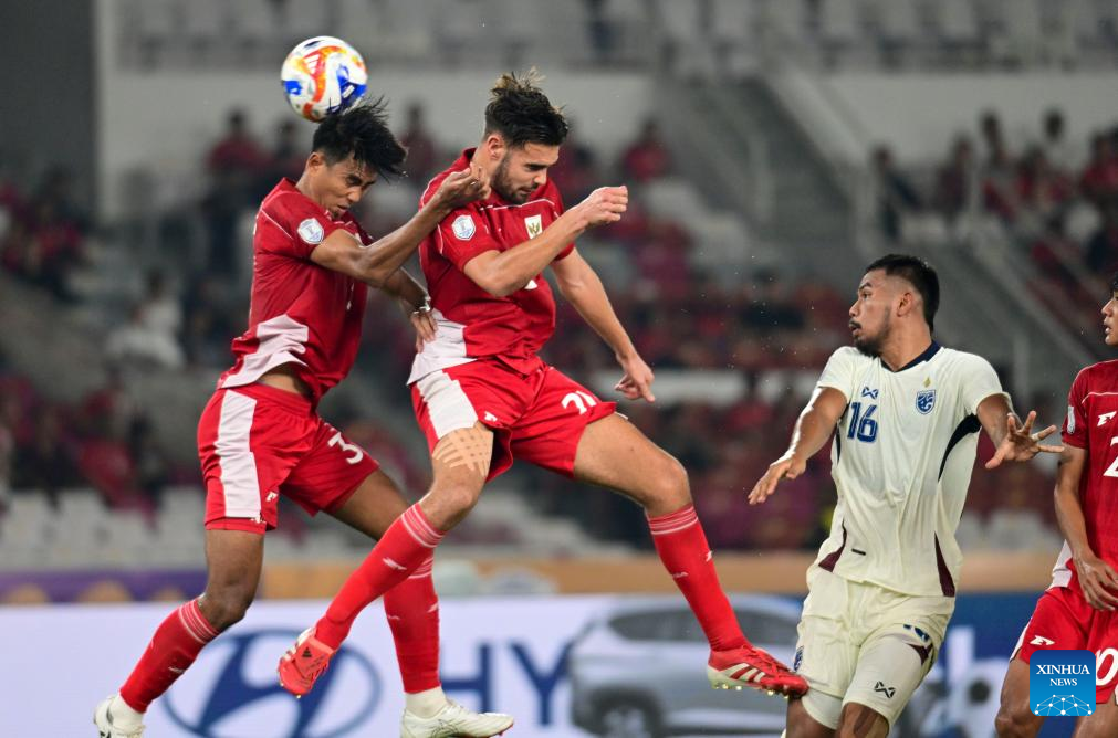 Jens Raven (2nd L) of Indonesia competes during the ASEAN Football Federation (AFF) U23 Championship 2025 semifinal between Indonesia and Thailand in Jakarta, Indonesia, July 25, 2025. (Xinhua/Zulkarnain)