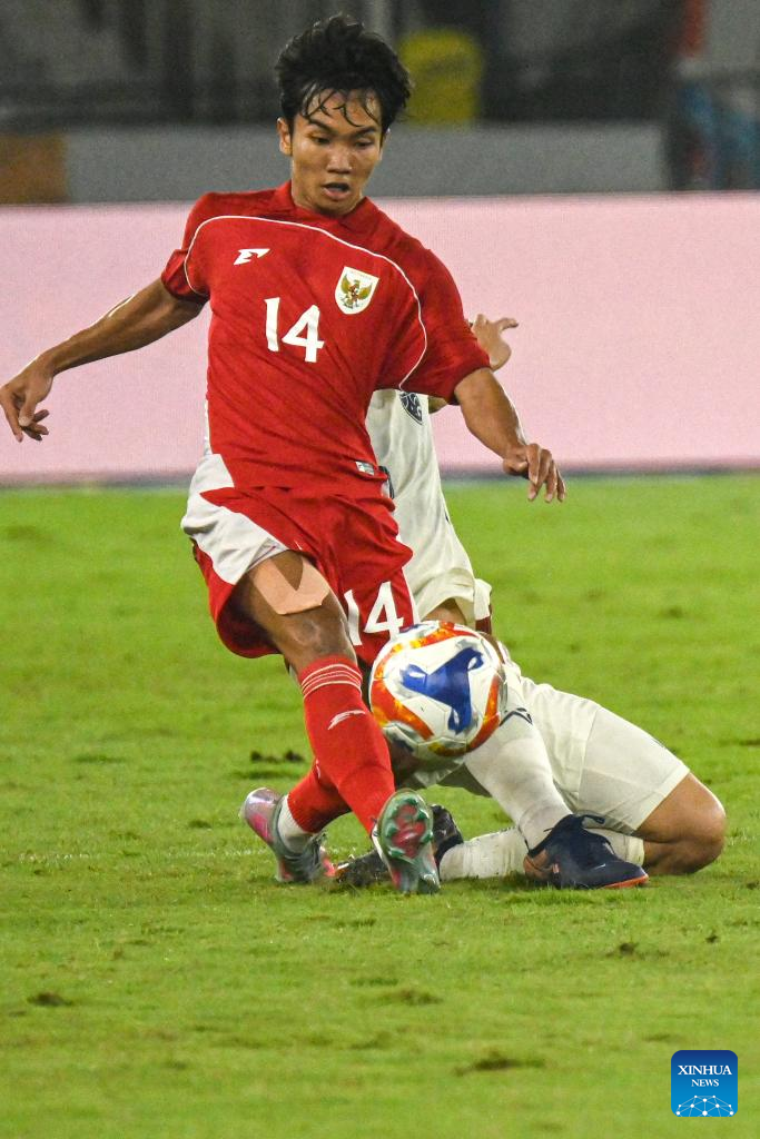 Dominikus Dion Oktawian Wibowo (L) of Indonesia competes during the ASEAN Football Federation (AFF) U23 Championship 2025 semifinal between Indonesia and Thailand in Jakarta, Indonesia, July 25, 2025. (Xinhua/Agung Kuncahya B.)