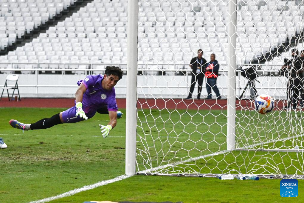 Nicholas Guimaraes, goal keeper of the Philippines, fails to save a goal during the ASEAN Football Federation (AFF) U23 Championship 2025 semifinal between Vietnam and the Philippines in Jakarta, Indonesia, July 25, 2025. (Xinhua/Agung Kuncahya B.)