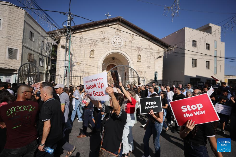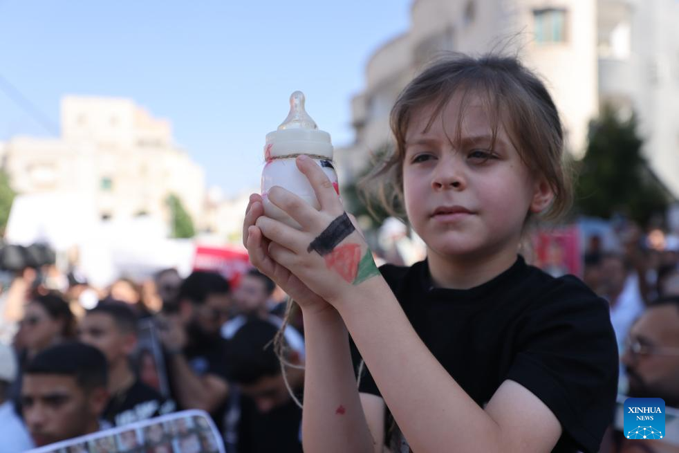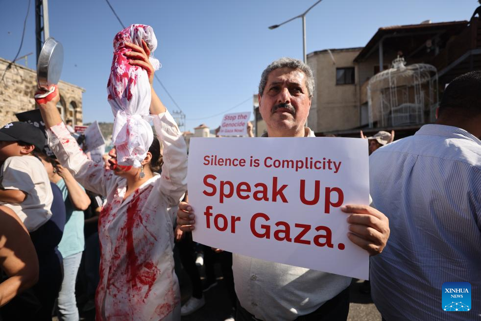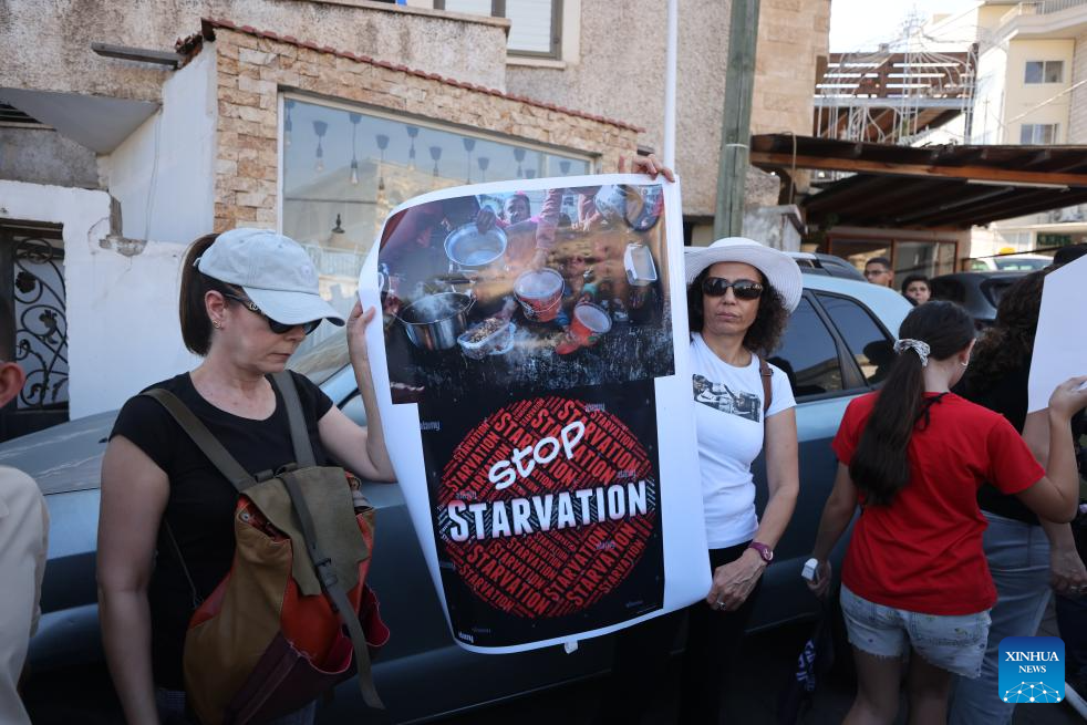 People protest to call for the lifting of all restrictions on humanitarian aid to the Gaza Strip in Sakhnin, northern Israel, July 25, 2025. (Photo by Jamal Awad/Xinhua)