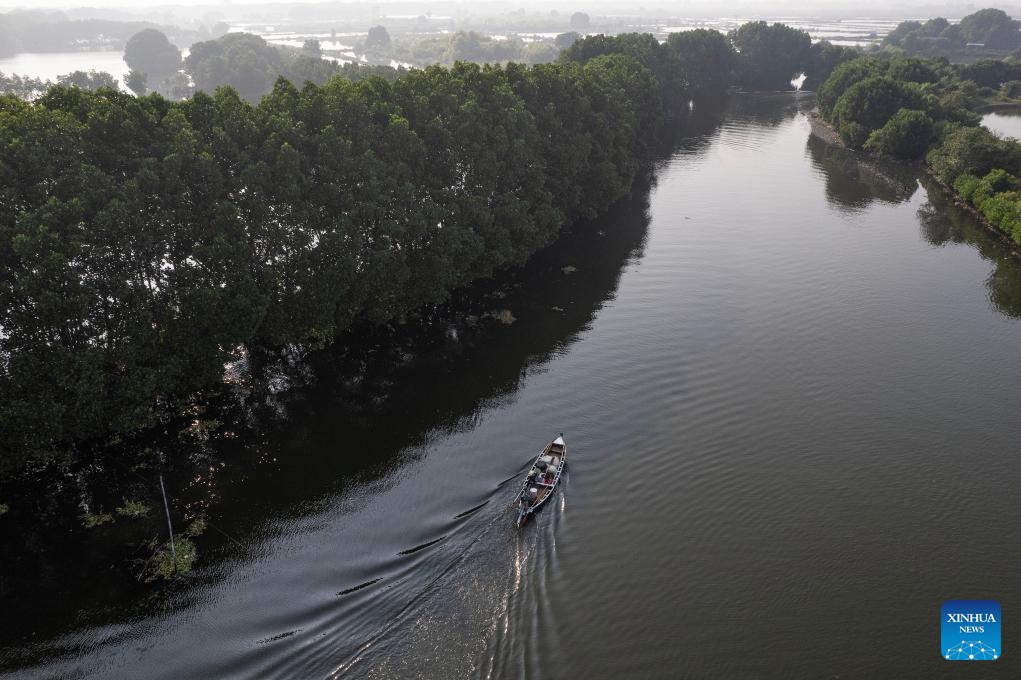 A drone photo shows a fishing boat returning home along a river, flanked by mangrove trees, at Tarumajaya village of Bekasi district, in West Java province, Indonesia, July 26, 2025. July 26 marks the International Day for the Conservation of the Mangrove Ecosystem. Adopted by the General Conference of the United Nations Educational, Scientific and Cultural Organisation (UNESCO) in 2015, this special day aims to raise awareness of the importance of mangrove ecosystems as "unique, special and vulnerable ecosystem" and to promote solutions for their sustainable management, conservation and uses. (Xinhua/Veri Sanovri)
