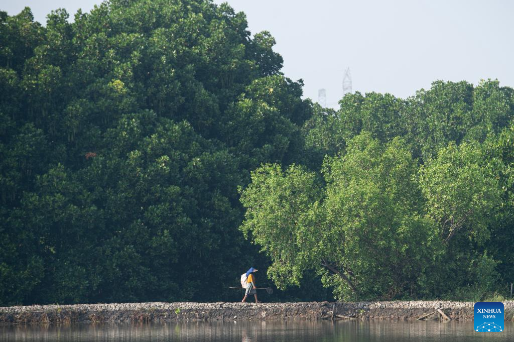 A woman walks on the embankment of a seaweed pond at a mangrove forest area in Tarumajaya village of Bekasi district, West Java province, Indonesia, July 26, 2025. July 26 marks the International Day for the Conservation of the Mangrove Ecosystem. Adopted by the General Conference of the United Nations Educational, Scientific and Cultural Organisation (UNESCO) in 2015, this special day aims to raise awareness of the importance of mangrove ecosystems as "unique, special and vulnerable ecosystem" and to promote solutions for their sustainable management, conservation and uses. (Xinhua/Veri Sanovri)