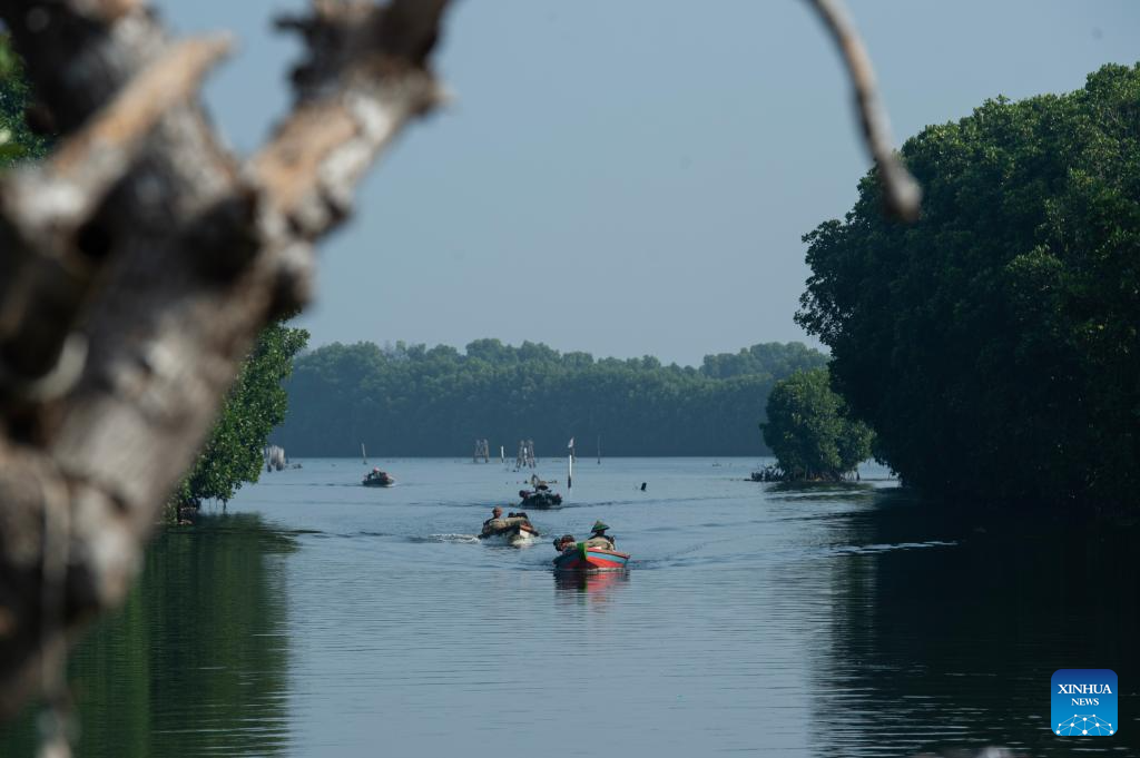 Fishing boats return home along a river, flanked by mangrove trees, at Tarumajaya village of Bekasi district, in West Java province, Indonesia, July 26, 2025. July 26 marks the International Day for the Conservation of the Mangrove Ecosystem. Adopted by the General Conference of the United Nations Educational, Scientific and Cultural Organisation (UNESCO) in 2015, this special day aims to raise awareness of the importance of mangrove ecosystems as "unique, special and vulnerable ecosystem" and to promote solutions for their sustainable management, conservation and uses. (Xinhua/Veri Sanovri)