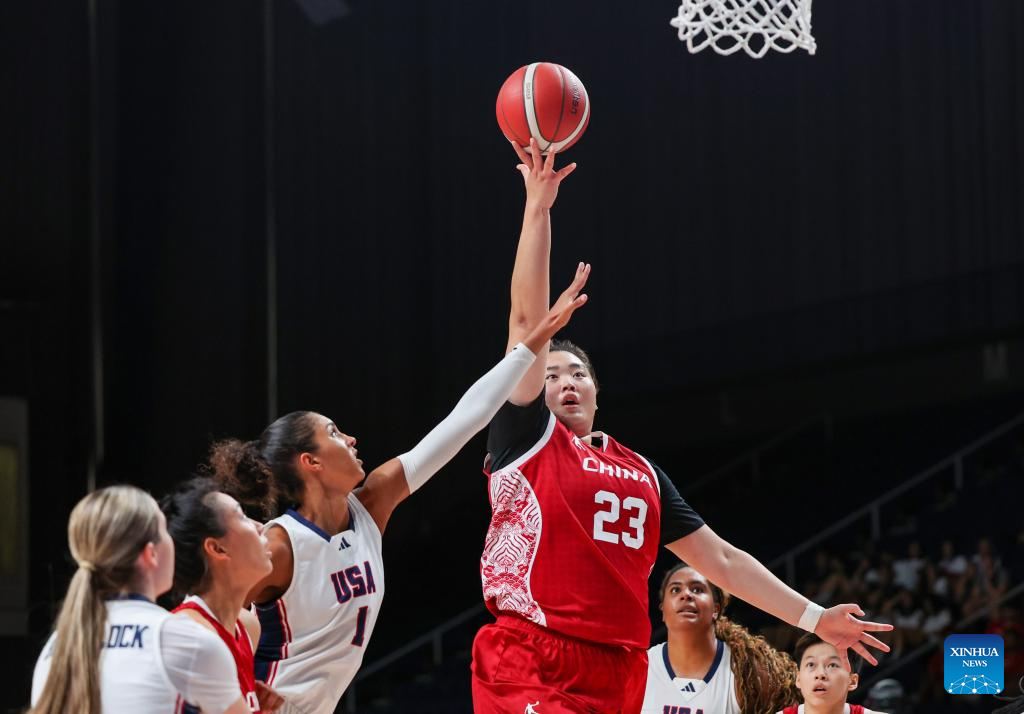 Liu Yutong (3rd R) of China goes to basket during the women's basketball final between China and the United States at the Rhine-Ruhr 2025 FISU World University Games in Essen, Germany, July 25, 2025. (Xinhua/Zhang Fan)