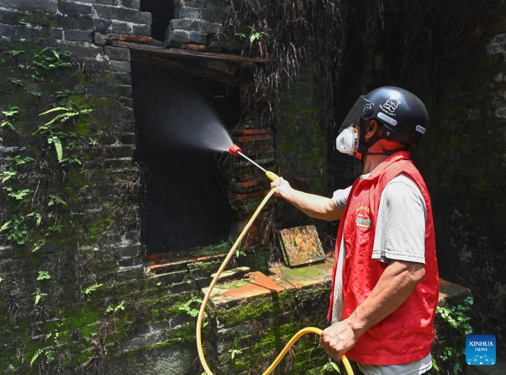 A staff member sprays insecticide at Zhuangtou Village in Shunde, Foshan City, south China's Guangdong Province, July 25, 2025. Foshan launched a campaign to decrease mosquitoes and increase sanitation level of the city. (Xinhua/Xiao Ennan)