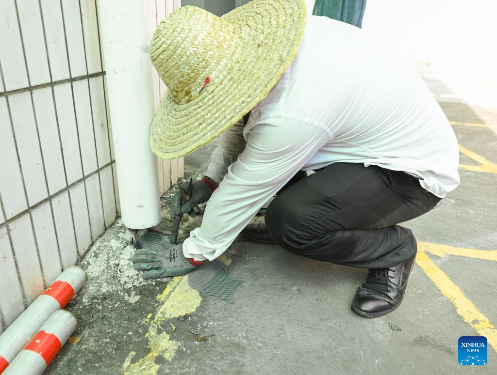 A staff member installs insect-proof nets on the sewer system at Guangzhou University of Chinese Medicine Shunde Hospital in Foshan City, south China's Guangdong Province, July 25, 2025. Foshan launched a campaign to decrease mosquitoes and increase sanitation level of the city. (Xinhua/Xiao Ennan)
