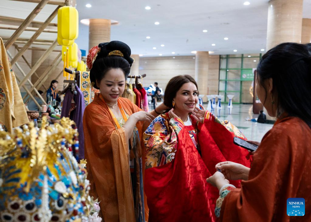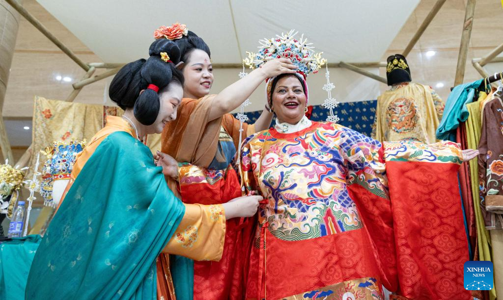 A participant (R) of the Shanghai Cooperation Organization (SCO) Media and Think Tank Summit tries traditional Chinese attire at the venue of the summit in Zhengzhou, central China's Henan Province, July 25, 2025. Participants of the summit are treated to a showcase of items listed as intangible cultural heritage, along with folk culture performances with local characteristics, at the venue of the summit, which is held here from July 23 to 27. (Xinhua/Bai Xueqi)