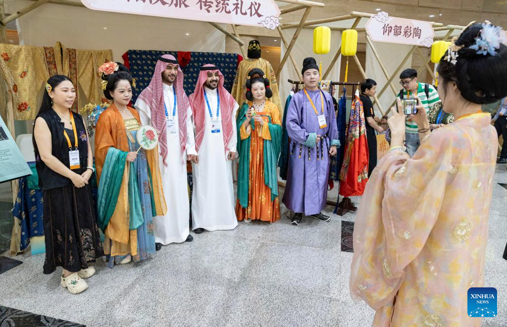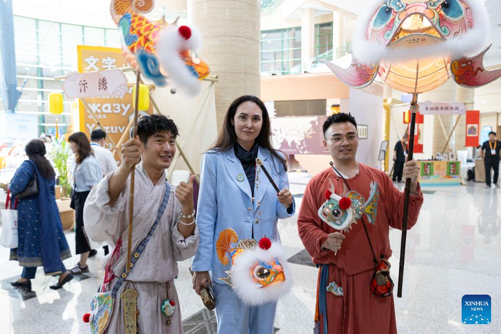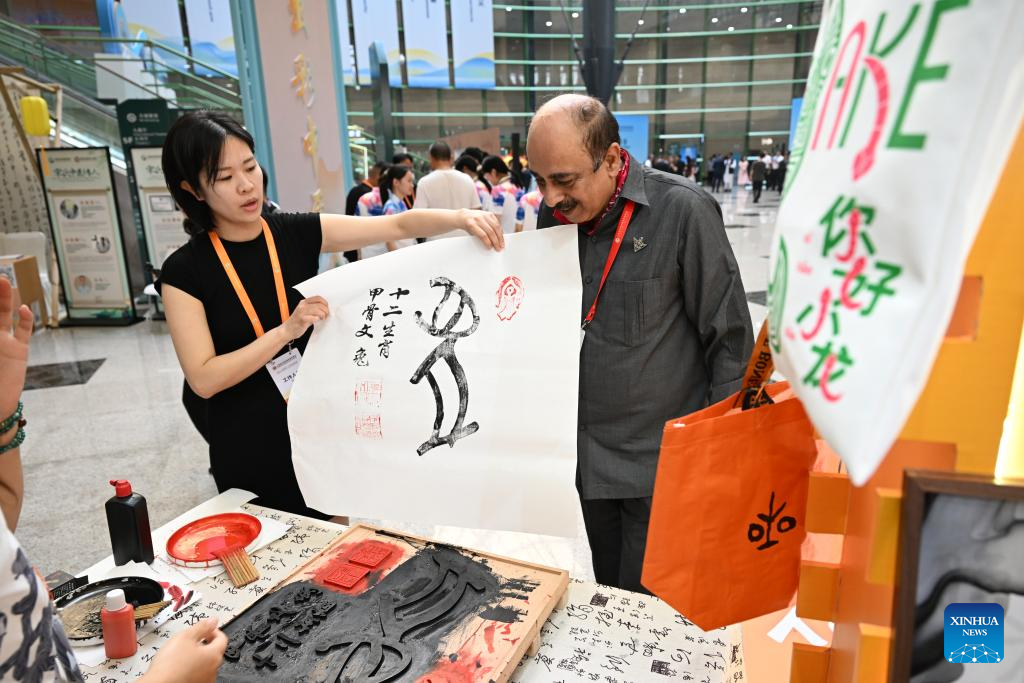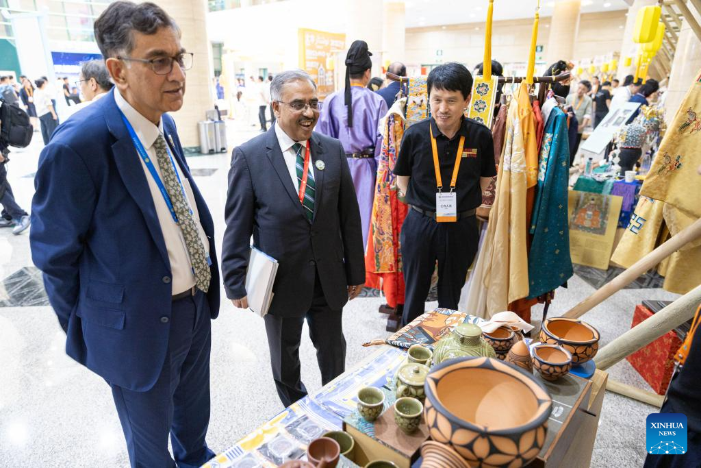 Participants of the Shanghai Cooperation Organization (SCO) Media and Think Tank Summit visit the booth of Anyang City of Henan at the venue of the summit in Zhengzhou, capital of central China's Henan Province, July 24, 2025. Participants of the summit are treated to a showcase of items listed as intangible cultural heritage, along with folk culture performances with local characteristics, at the venue of the summit, which is held here from July 23 to 27. (Xinhua/Fu Tian)