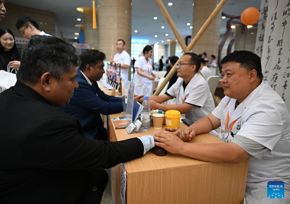 Participants of the Shanghai Cooperation Organization (SCO) Media and Think Tank Summit experience the pulse diagnosis of traditional Chinese medicine at the venue of the summit in Zhengzhou, central China's Henan Province, July 25, 2025. Participants of the summit are treated to a showcase of items listed as intangible cultural heritage, along with folk culture performances with local characteristics, at the venue of the summit, which is held here from July 23 to 27. (Xinhua/Li Jianan)