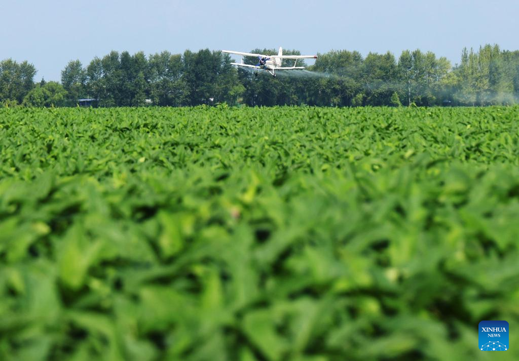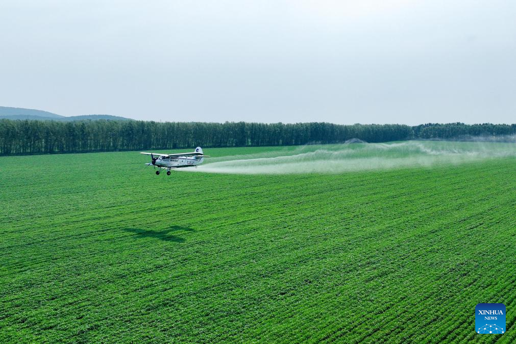 An agricultural aircraft flies above a soybean field at the Beidahuang Group Heilongjiang Hongxing Farm in Bei'an, northeast China's Heilongjiang Province, July 25, 2025. Aerial crop protection operations have commenced across various agricultural production units of the Beidahuang Group, covering more than 30 million mu (about 2 million hectares) of dry farmlands. (Photo by Hou Yue/Xinhua)
