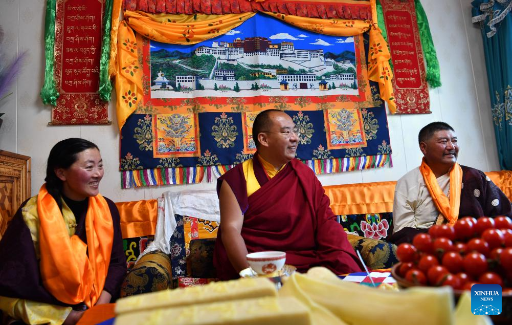 Panchen Erdeni Chos-kyi rGyal-po visits a resident's home at a local village in Nagqu, southwest China's Xizang Autonomous Region, July 23, 2025. Panchen Erdeni Chos-kyi rGyal-po visited the cities of Qamdo and Nagqu in southwest China's Xizang Autonomous Region from July 7 to 23, attending a series of religious activities and carrying out social research. (Photo by Chogo/Xinhua)