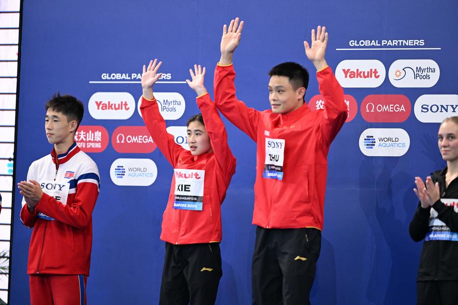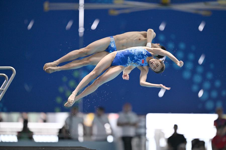SINGAPORE, July 27 (Xinhua) -- China continued its dominant run in diving at the World Aquatics Championships here on Sunday, capturing two gold medals in the mixed synchronized 10-meter platform and the men's one-meter springboard events.