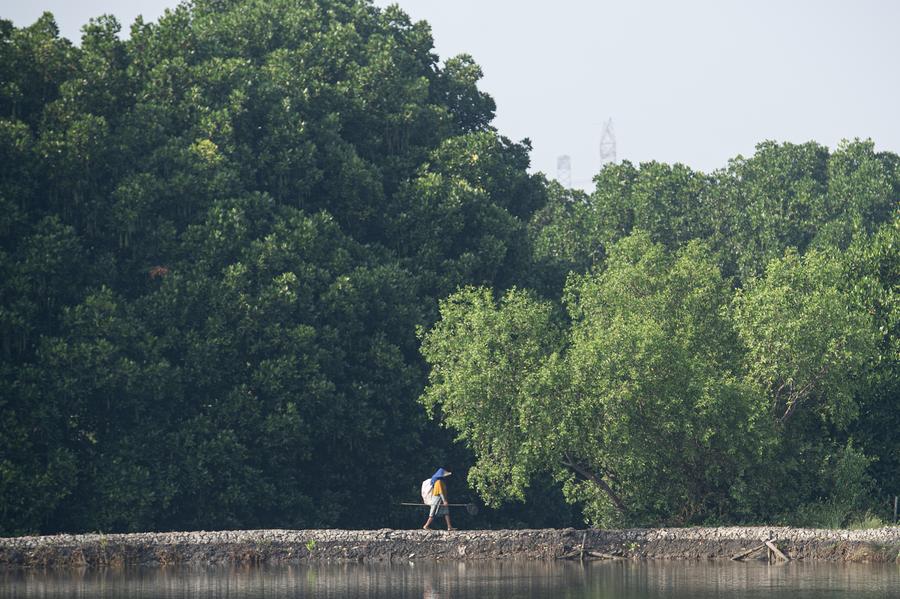 A woman walks on the embankment of a seaweed pond at a mangrove forest area in Tarumajaya village of Bekasi district, West Java province, Indonesia, July 26, 2025. (Xinhua/Veri Sanovri)