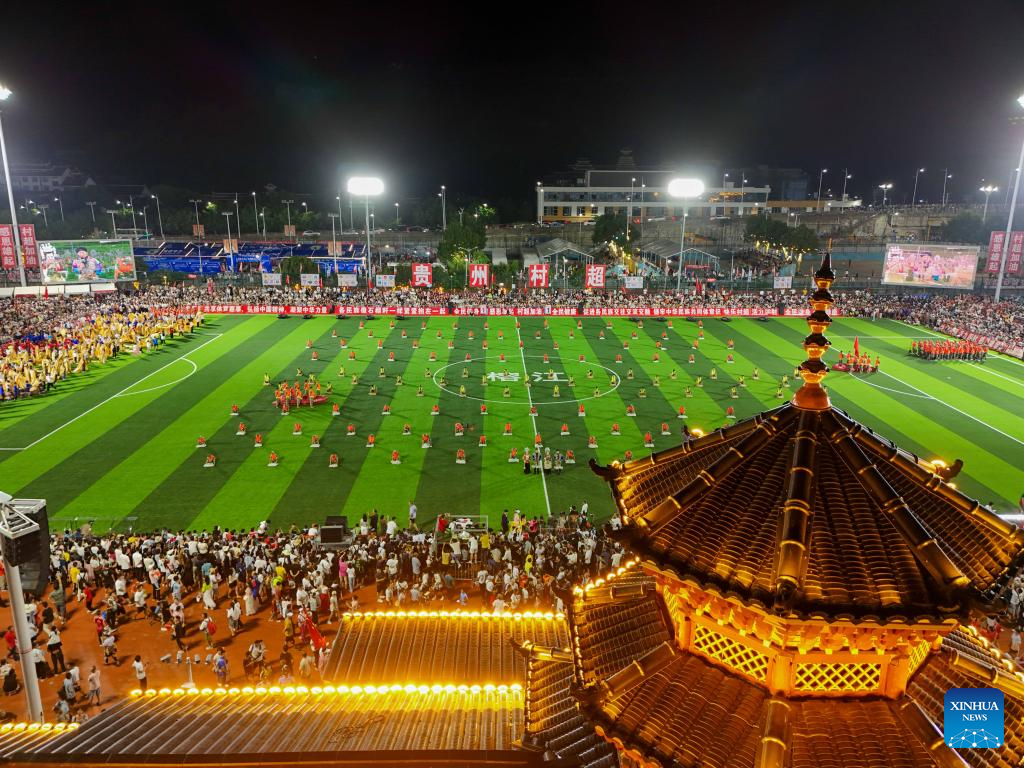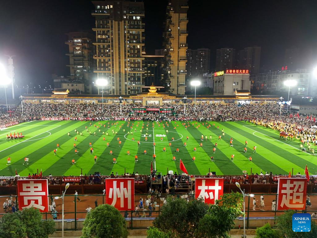 An aerial drone photo taken on July 26 shows the restart ceremony of the "Village Super League," also known as Cun Chao, staged in Rongjiang County, Guizhou Province in southwest China. (Xinhua/Liu Xu)