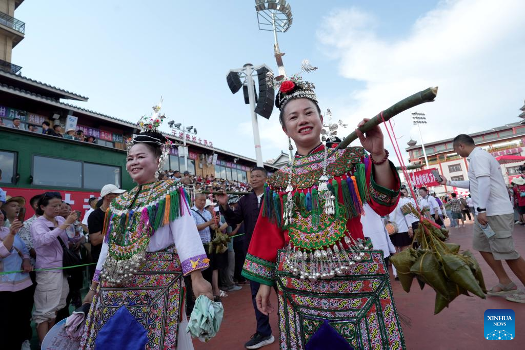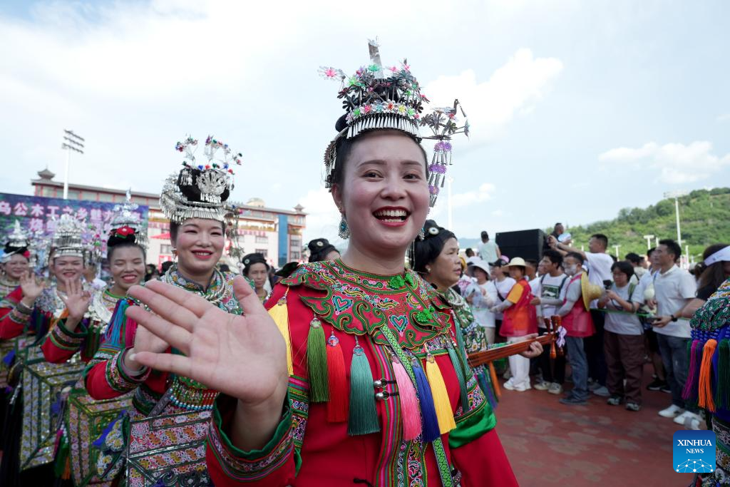 Cheerleading squad in ethnic costumes attend the restart ceremony of the "Village Super League," also known as Cun Chao, staged in Rongjiang County, Guizhou Province in southwest China, July 26, 2025. (Photo by Long Jianrui/Xinhua)