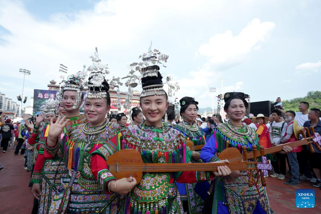 Tourists and cheerleading squad in ethnic costumes pose for photo during the restart ceremony of the "Village Super League," also known as Cun Chao, staged in Rongjiang County, Guizhou Province in southwest China, July 26, 2025. (Photo by Long Jianrui/Xinhua)