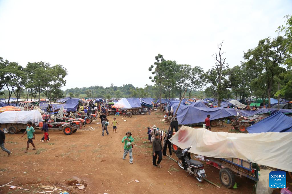 Cambodian evacuees from Cambodia-Thai border conflict gather at a refuge in Oddar Meanchey province, Cambodia on July 26, 2025. (Photo by Sao Khuth/Xinhua)