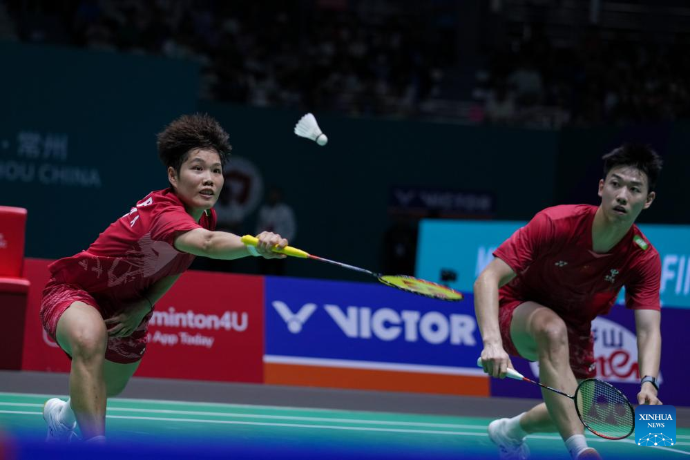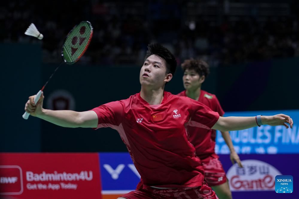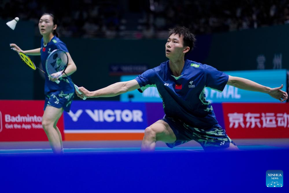 Feng Yanzhe/Huang Dongping (R) of China compete during the mixed doubles final between Feng Yanzhe/Huang Dongping of China and Jiang Zhenbang/Wei Yaxin of China at the China Open 2025 badminton tournament in Changzhou, east China's Jiangsu Province, July 27, 2025. (Xinhua/Li Bo)