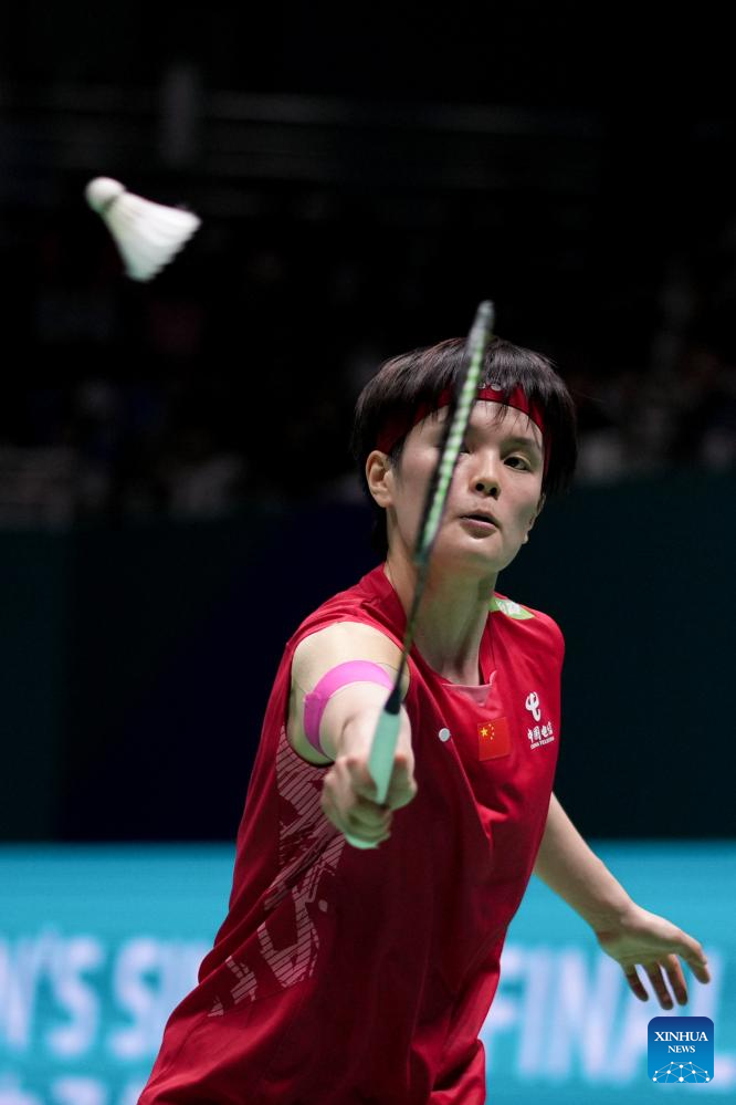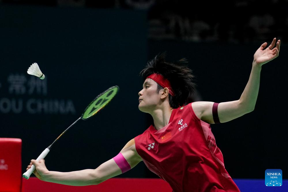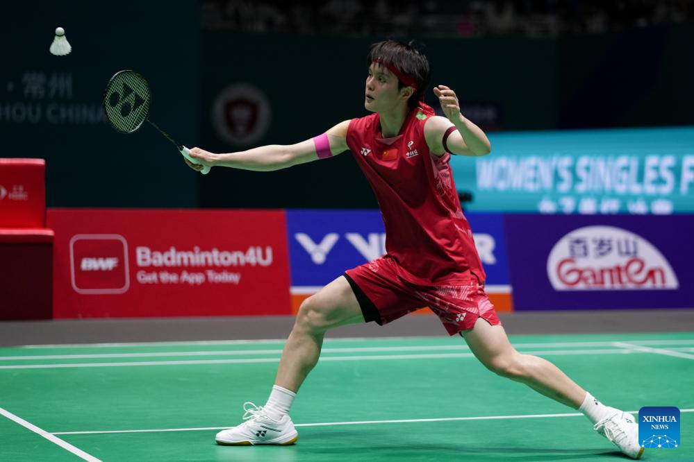 Wang Zhiyi of China competes during the women's singles final match between Wang Zhiyi of China and Han Yue of China at the China Open 2025 badminton tournament in Changzhou, east China's Jiangsu Province, July 27, 2025. (Xinhua/Li Bo)