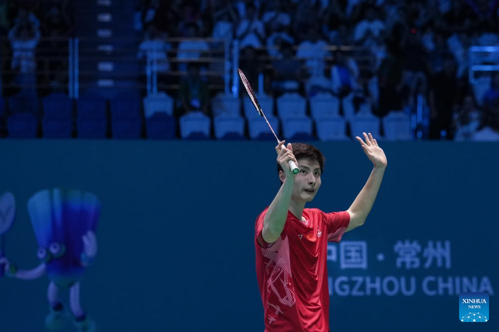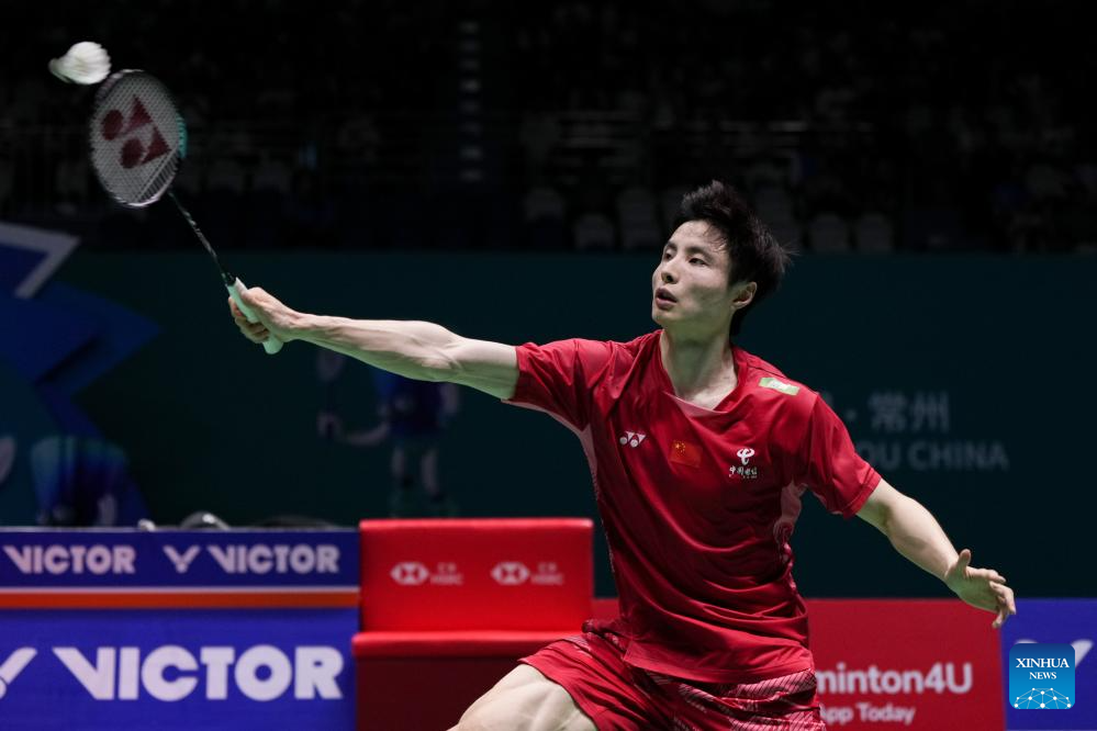 Wang Zhengxing of China competes during the men's singles final match between Shi Yuqi of China and Wang Zhengxing of China at the China Open 2025 badminton tournament in Changzhou, east China's Jiangsu Province, July 27, 2025. (Xinhua/Li Bo)