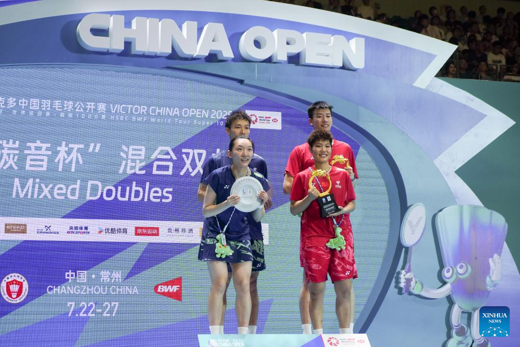 Winner Feng Yanzhe (R) /Huang Dongping of China pose for photos during the awarding ceremony for the mixed doubles between Feng Yanzhe/Huang Dongping of China and Jiang Zhenbang/Wei Yaxin of China at the China Open 2025 badminton tournament in Changzhou, east China's Jiangsu Province, July 27, 2025. (Photo by Liu Zhenrui/Xinhua)