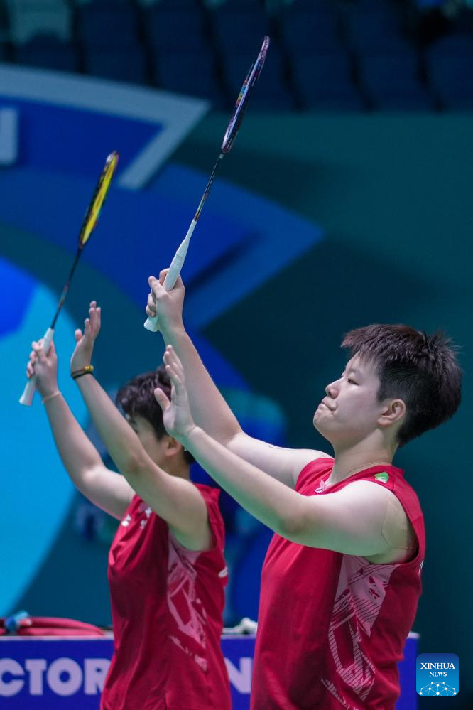 In the women's doubles, Liu Shengshu and Tan Ning outlasted Jia Yifan and Zhang Shuxian 24-22, 17-21, 21-14 in 69 minutes, securing their third consecutive title.