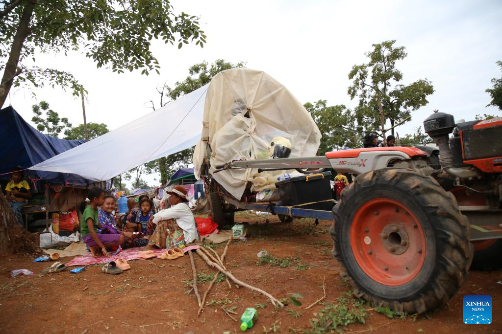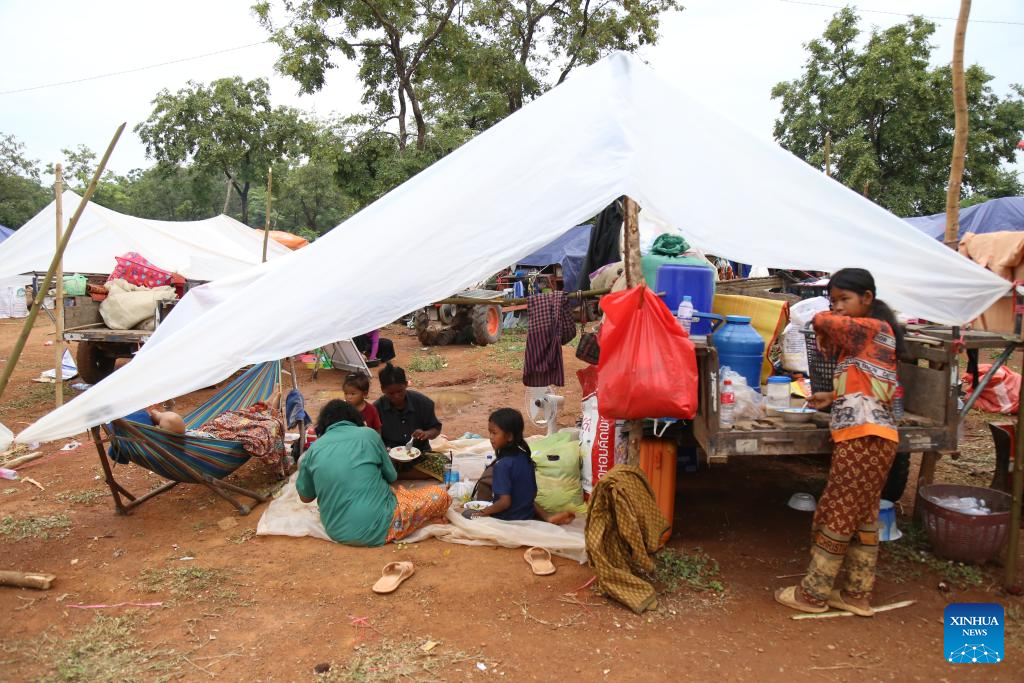 Cambodian evacuees from Cambodia-Thai border conflict gather at a refuge in Oddar Meanchey province, Cambodia, July 26, 2025. About 80,000 Cambodian villagers have fled their homes for safe refuge as armed clashes between Cambodian and Thai soldiers over disputed border areas have entered a fourth day, a defense ministry spokesperson said on Sunday. (Photo by Sao Khuth/Xinhua)