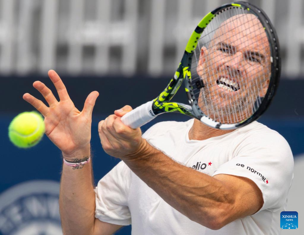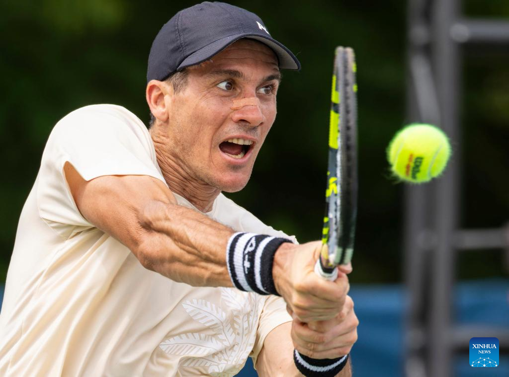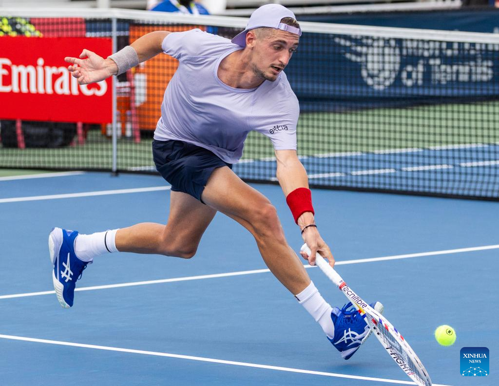 Facundo Bagnis of Argentina returns the ball during the men's singles qualifying match between Terence Atmane of France and Facundo Bagnis of Argentina at the 2025 National Bank Open tennis tournament in Toronto, Canada, on July 26, 2025. (Photo by Zou Zheng/Xinhua)