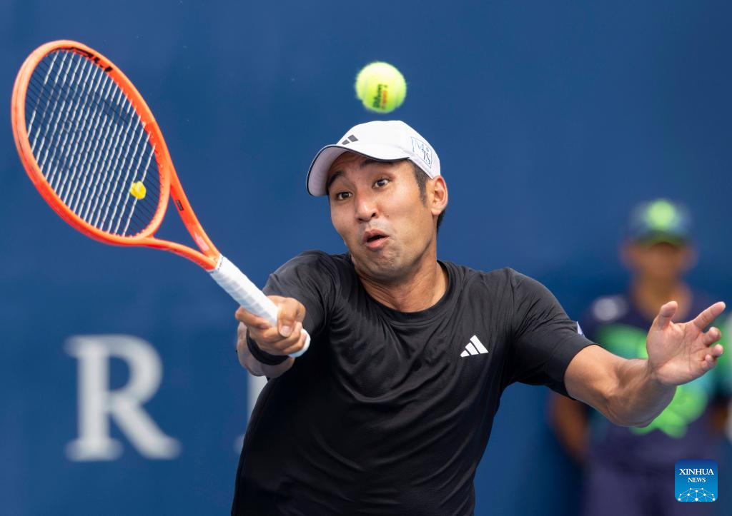 Uchiyama Yasutaka of Japan returns the ball during the men's singles qualifying match between Mochizuki Shintaro of Japan and Uchiyama Yasutaka of Japan at the 2025 National Bank Open tennis tournament in Toronto, Canada, on July 26, 2025. (Photo by Zou Zheng/Xinhua)