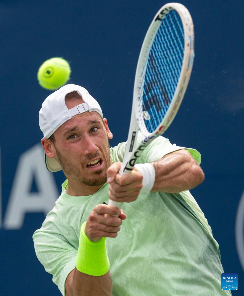Juan Pablo Ficovich of Argentina returns the ball during the men's singles qualifying match between Juan Pablo Ficovich of Argentina and Kyrian Jacquet of France at the 2025 National Bank Open tennis tournament in Toronto, Canada, on July 26, 2025. (Photo by Zou Zheng/Xinhua)