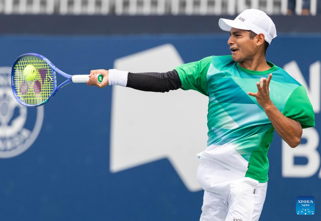 Juan Carlos Aguilar of Canada returns the ball during the men's singles qualifying match between Adrian Mannarino of France and Juan Carlos Aguilar of Canada at the 2025 National Bank Open tennis tournament in Toronto, Canada, on July 26, 2025. (Photo by Zou Zheng/Xinhua)