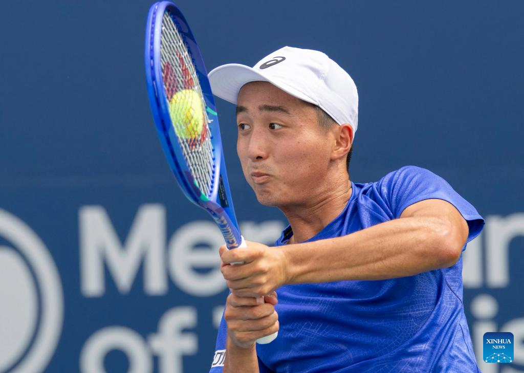 Mochizuki Shintaro of Japan returns the ball during the men's singles qualifying match between Mochizuki Shintaro of Japan and Uchiyama Yasutaka of Japan at the 2025 National Bank Open tennis tournament in Toronto, Canada, on July 26, 2025. (Photo by Zou Zheng/Xinhua)