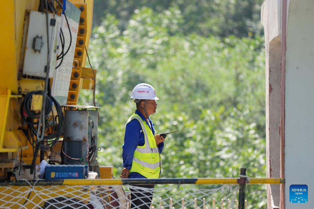 A worker oversees the erection of the last box girder at the construction site of a mega bridge along the Xi'an-Ankang High-Speed Railway in northwest China's Shaanxi Province, July 28, 2025. All box girder erection tasks for bridges along the Xi'an-Ankang High-Speed Railway have been completed as of Monday, laying a solid foundation for the rest of the construction.The rail line spans 171 kilometers with a designed speed of 350 kilometers per hour. When in operation, it will significantly facilitate travel for residents along the route. (Xinhua/Li Yibo)