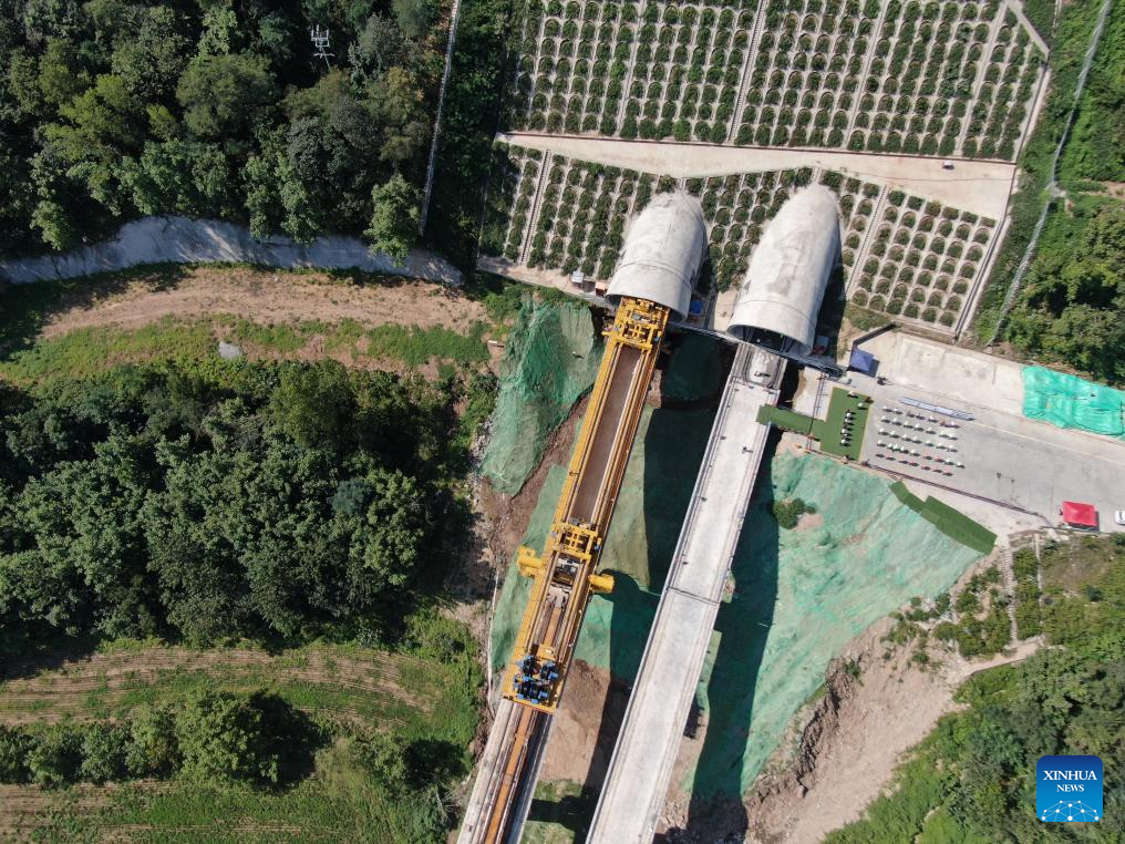 Workers erect the last box girder at the construction site of a mega bridge along the Xi'an-Ankang High-Speed Railway in northwest China's Shaanxi Province, July 28, 2025. All box girder erection tasks for bridges along the Xi'an-Ankang High-Speed Railway have been completed as of Monday, laying a solid foundation for the rest of the construction.The rail line spans 171 kilometers with a designed speed of 350 kilometers per hour. When in operation, it will significantly facilitate travel for residents along the route. (Xinhua/Li Yibo)